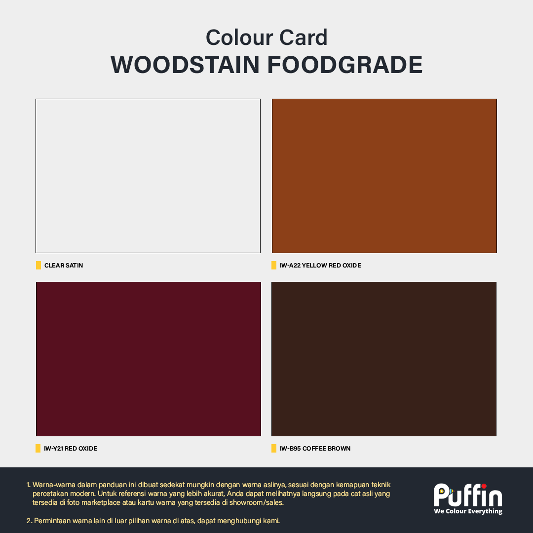 Pewarna dan wax berbahan dasar alami, sangat aman untuk peralatan berbahan kayu yang tersentuh makanan. Produk ini membuat warna kayu lebih kuat, keras dan awet.